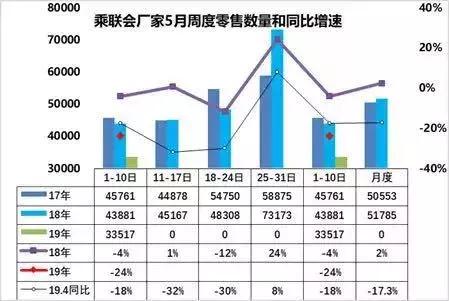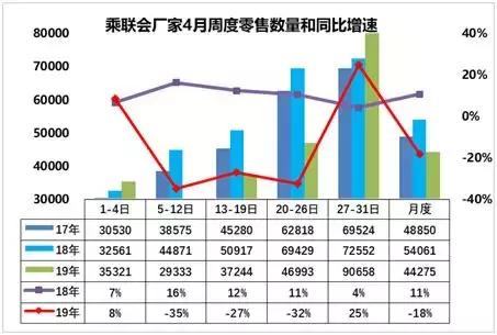 我们还可以对比下,2018年和2019年周均零售数量,今年四月份前四周都是大幅弱于去年,只有最后一周被硬生生拉起来。这种最后一周零售数量超过9万辆的“神奇现象”非常难解释,最大的一种可能是因为经销商突然放大的优惠触动了部分消费者在月末集中消费。而这种集中消费带来的问题是可能直接把5月份的数据拖垮,乘联会5月1日-10日的数据显示,其同比跌幅高达24%——当然这里面也有一个因素在于今年五一假期有四天。