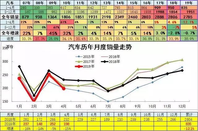 如果我们按照往年的数据来看,3月份销量一般是上半年的销量高点,这样的话今年上半年对于经销商来说没有什么好消息。我们可以根据乘联会方面给出的图表看到,2019年4月的销量已经跌到了2015年的水平,并且在1月、2月和4月的销量基本一致。而前4个月的乘用车销量已经低于了2015年,分别为683.76万辆和697.39万辆。